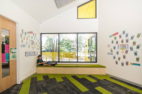 This $2m project includes new construction and extensive refurbishment to existing school buildings. The new learning facility, for Grades 5 & 6, is centred around a flexible activity space that can also be used for large presentations and school gatherings. An extended roofline and courtyard around the entry also provide an outdoor learning area for students. A completely new fit-out and organisation of the reception, administration offices and staff facilities has transformed the school.
